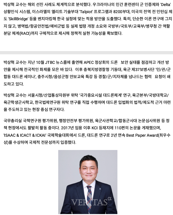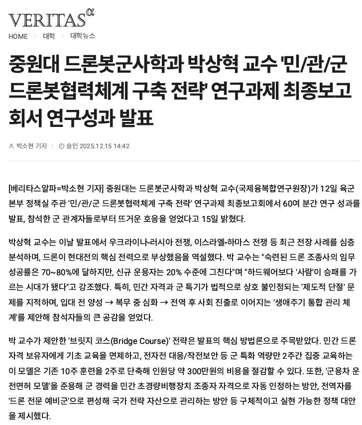 #1. 언론보도_육군본부 연구용역(민관군_드론) 최종보고회 발표 관리자 입력 2025-12-16 10:30 읽음 111 목록 이전글국정원_군_경 대상_대드론체계 입법화 방향 제시 25.12.16 다음글#2. 언론보도_대드론 전문가(박상혁 연구원장)_안보특강 및 육군본부 정책연구 25.12.16 댓글 0 댓글목록 등록된 댓글이 없습니다.